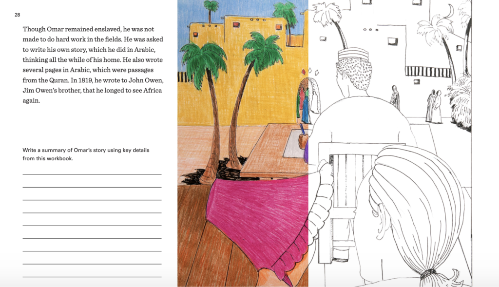 The teachers who were involved with the Omar Education Initiative received a training from Latisha Smith and Sarah Carrier. Latisha created the Omar Workbook when she worked at Spoleto Festival. The workbook tells Omar ibn Said’s life story through illustrations and text. Latisha brought the teachers through the history of the Workbook and explained how it could be used in the classroom.