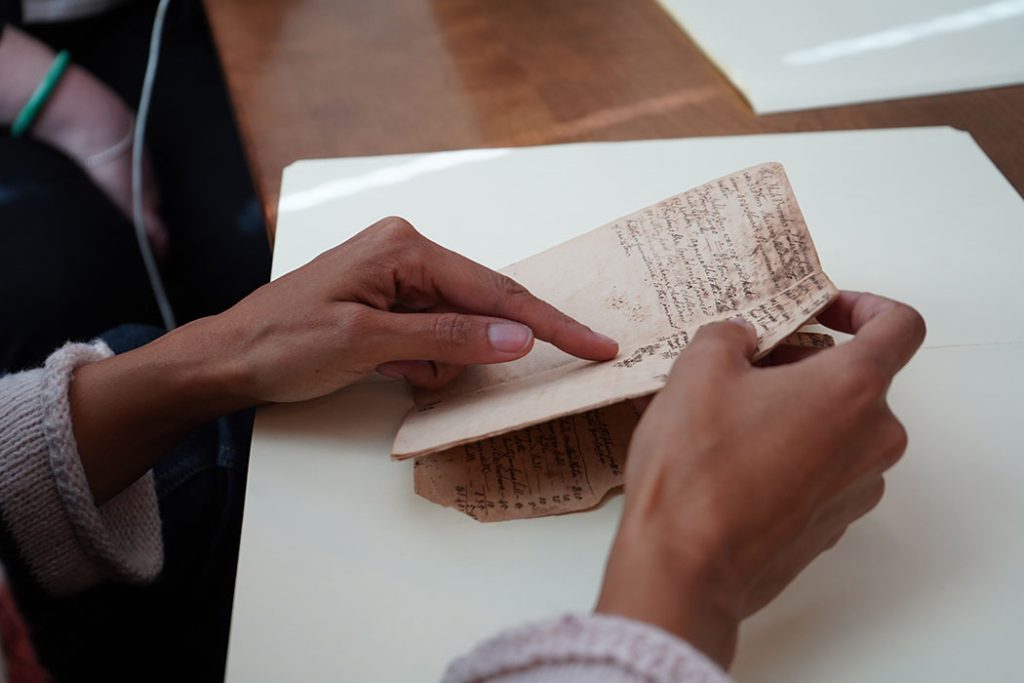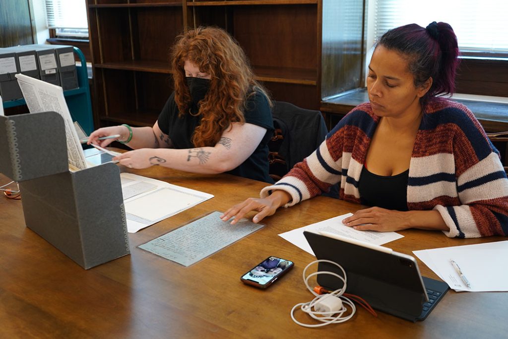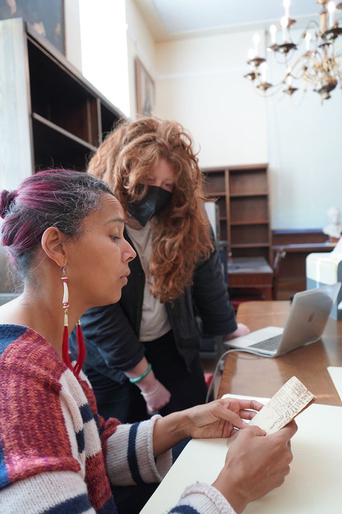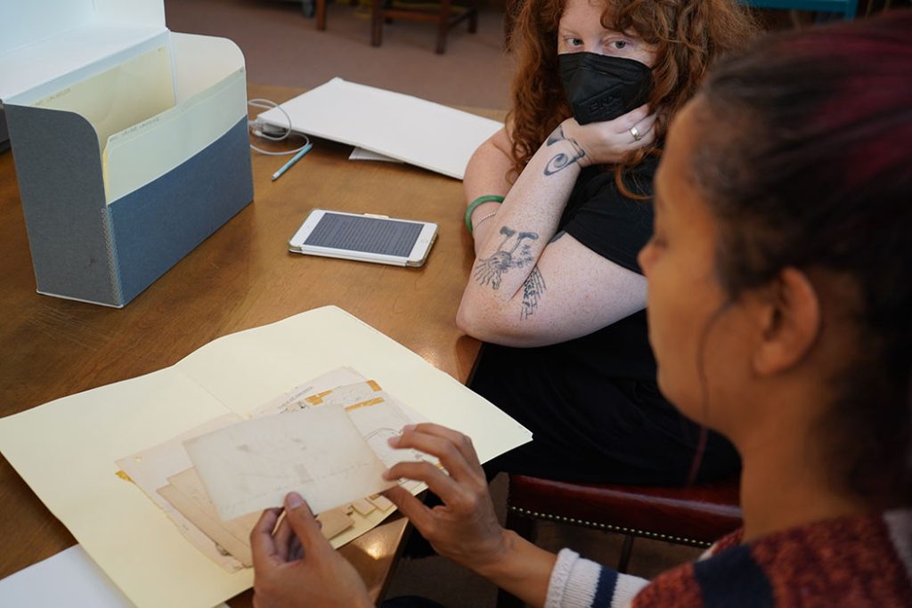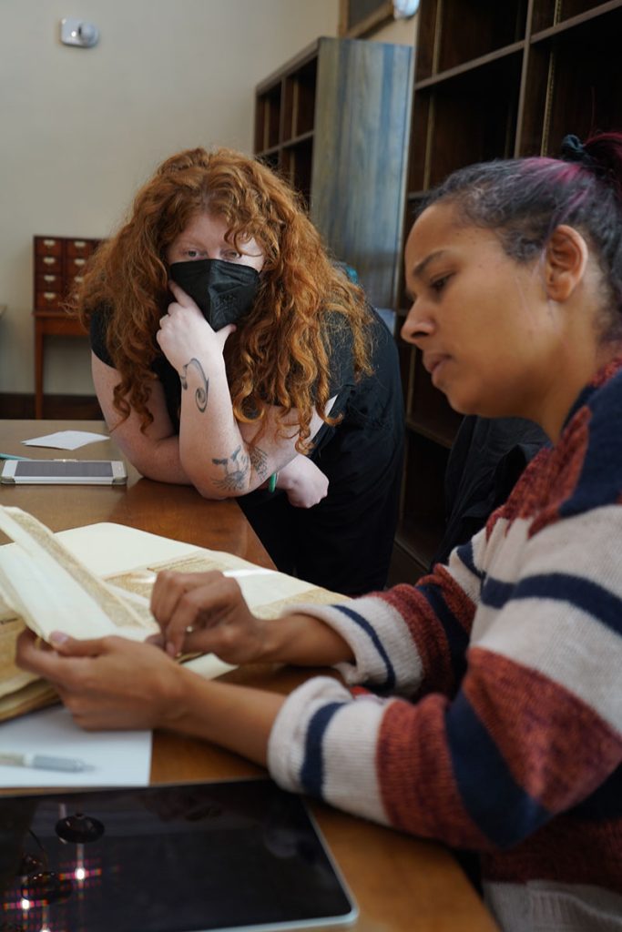 Rhiannon is interested in cross-cultural interactions, race relations, racial perceptions, archival materials created by marginalized groups, and moments of cultural exchange from the 1800s to the early 1900s. Through her archival research, she is interested in revealing and undoing what we think we know about history; in her own words, “I love everything that hammers against this ironclad narrative of the last 100 years.” My work begins in the months leading up to Rhiannon’s on-campus research visits. I start with a list of terms that I use to search Wilson Library’s online finding aids to identify collections and materials that may be of interest to Rhiannon. If the finding aid has digitized items, or if the item I am interested in is digitized, I can do a large portion of my work remotely. For collections or items that are not available digitally through the finding aid (sometimes there are access restrictions, for example), I make an appointment and then make requests to view items in Wilson’s research room; my process is typically an even mix of both remote and in-person research. The goal is to generate a research dossier of previewed materials that fit Rhiannon’s timeframe and geographical location and include some of her more specific research interests. This process allows us to slightly condense the research process as Rhiannon is only with us in person for a week at a time, and it often takes weeks and weeks of research to put together the curated dossier of items—we do not have time to start from the beginning of the research process during her visits. Rhiannon and I go into Wilson’s research room when she is in town, sit down with the pre-selected items, and begin a deeper dive into the materials. I bring her up to speed with contextual information about the item, the collection it is from, the person or community that created the item, etc. Then, she can take her time reading, writing, reflecting, and taking photos of what she finds most interesting.