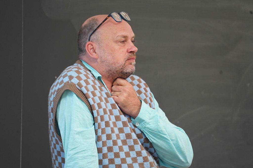 Daniel zoomed into Joey Richards’s COMM 260: Intro to Performance and Social Change. Richards’s Fall 2023 class explored the theory and practice of performance as “a tool to raise consciousness, have difficult conversations, advocate for social change, imagine the world otherwise, and/or disrupt social norms.” Daniel’s visit was an active one wherein the students and the artist participated in theatre exercises together. After activating their bodies and minds, the group spent time talking about Rimini Protokoll and Daniel helped the class understand the approach that he takes to the collective and their work.